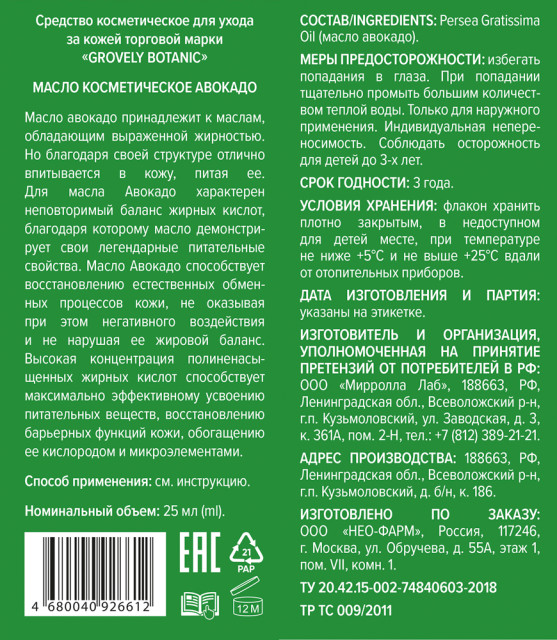 Масло авокадо косметическое 25мл Гровели Ботаник
