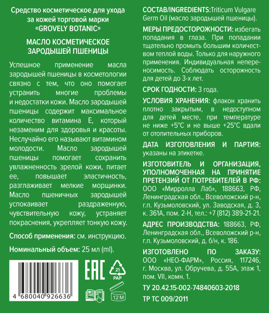 Масло зародышей пшеницы косметическое 25мл Гровели Ботаник