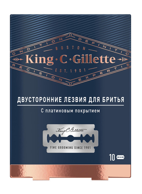 Двусторонние лезвия для бритья King C. Gillette из нержавеющей стали имеют платиновое покрытие для точного контуринга и длительного срока службы.