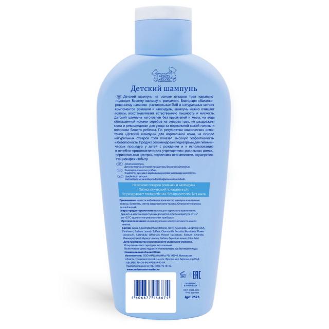 Детский шампунь на основе отваров трав серии "Наша мама" идеально подходит малышу с самого рождения. Благодаря сбалансированному наличию растительных ПАВ и натуральных мягких компонентов ромашки и календулы, шампунь нежно очищает волосы, восстанавливает естественную пышность и мягкость. Детский шампунь изготовлен без красителей и мыла, на воде обогащенной ионами серебра и на отварах трав. Шампунь не раздражает глазки ребенка, рекомендован для ухода за нормальной кожей головы. По результатам клинических испытаний «Детский шампунь» для нормальной кожи на основе натуральных отваров трав показал высокую эффективность и безопасность. Шампунь рекомендован педиатрами для ежедневных гигиенических процедур у детей с рождения и к использованию в лечебно-профилактических учреждениях: родильных домах, перинатальных центрах, отделениях неонатологии, акушерских стационарах и в быту. Применение: Нанести небольшое количество шампуня на влажные волосы, вспенить слегка массируя кожу головы. Ополоснуть волосы теплой водой. Меры предосторожности: Только для наружного применения. Хранить в местах недоступных для детей, при температуре от +5° до +25°С вдали от нагревательных приборов. Противопоказания: Индивидуальная непереносимость компонентов.