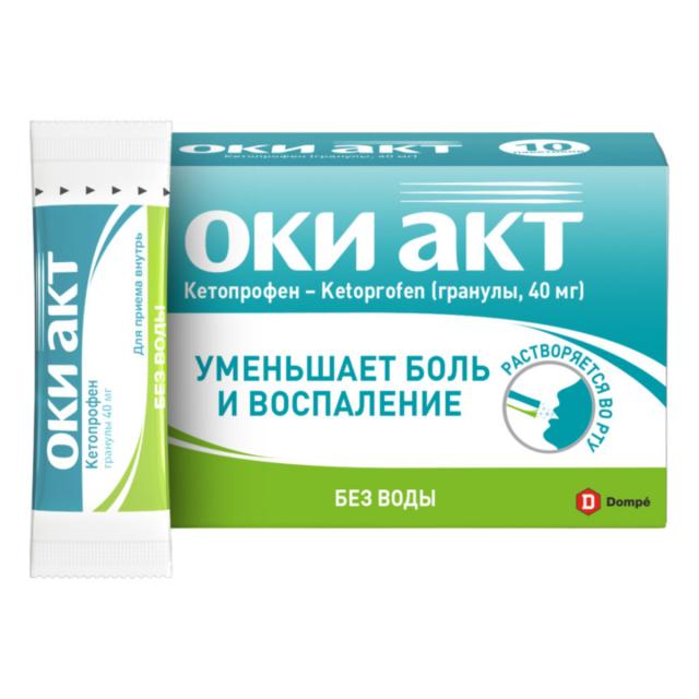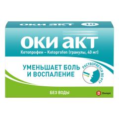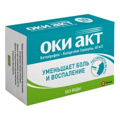 препарата ОКИ АКТ гранулы 40 мг выделяется почками в виде глюкуронидного метаболита в течение 24 часов. В фармакокинетическом исследовании, проведенном у 69 участников, плазменные концентрации составляли около 0,15 мкг/мл через 5 мин. Период полувыведения кетопрофена составляет 1,5 часа. Препарат не кумулируется.