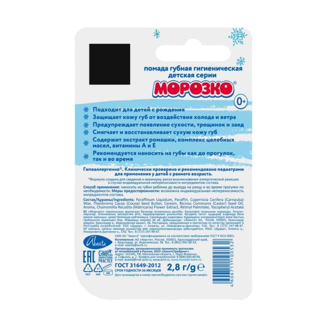 Защищает кожу губ от воздействия холода и ветра в холодное время года, обладает заживляющим и противовоспалительным действием, устраняет сухость и шелушение, восстанавливает естественную защиту кожи губ. За счёт комплекса минерального, касторового масел и масла какао, это защитная помада. Благодаря витаминам A, E и экстракту ромашки, это восстанавливающая помада. А комплекс масел и воска канделийского, препятствует потери влаги в коже, поэтому это увлажняющая помада. Зимняя гигиеническая губная помада "Морозко" имеет нежную тающую текстуру, поэтому обеспечивает легкое нанесение помады самым маленьким детям.