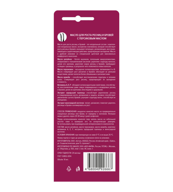 Способ применения: аккуратно нанесите масло на предварительно очищенные ресницы или брови, от середины к кончикам. Излишки можно удалить через 20-30 минут сухой салфеткой.
