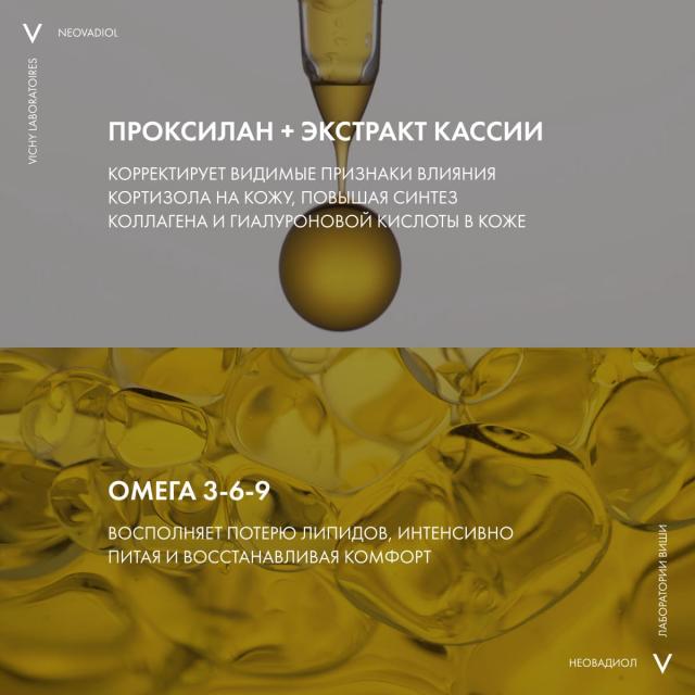 Лаборатория VICHY разработала питательный, смягчающий ночной крем сочетающий активные ингредиенты, запускающие механизмы восстановления кожи: Вулканическая вода Vichy, обогащенная 15 минералами, Проксилан, Экстракт Кассии, Омега 3-6-9 из растительных масел. Крем компенсирует видимые проявления менопаузы на коже, восполняя потерю липидов в коже, заметно разглаживая морщины, оставляя на коже чувство комфорта и делая ее ощутимо более упругой.