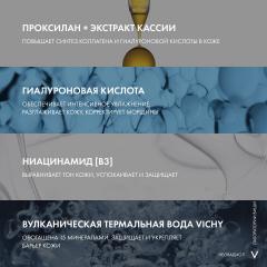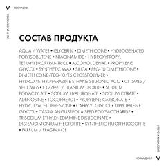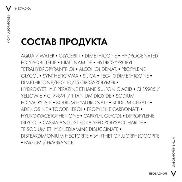 Инновация* от Vichy: Лаборатория Vichy разработала крем, соединяющий активные ингредиенты: Вулканическая вода Vichy, обогащенная 15 минералами; Проксилан; Экстракт Кассии; Гиалуроновая кислота натурального происхождения. Крем создан компенсировать видимые признаки менопаузы на коже с целенаправленным действием на восстановление плотности, сокращение морщин и повышение четкости контуров лица.