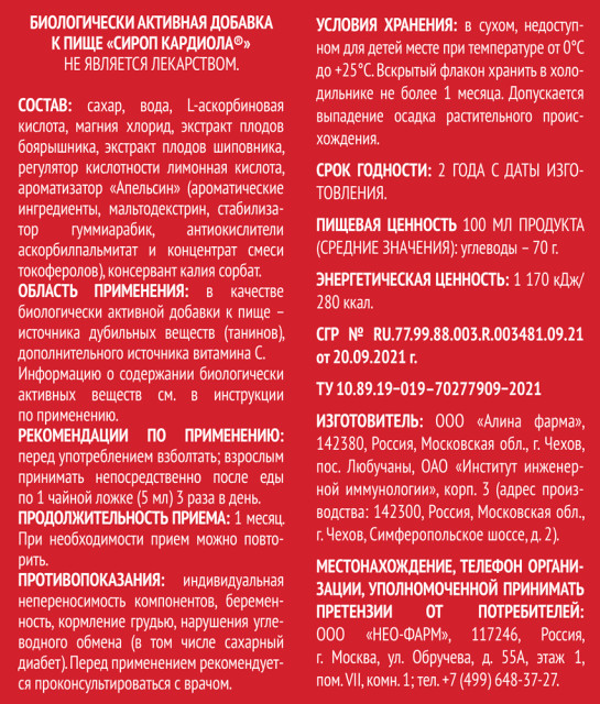 Состав: сахар, вода, L-аскорбиновая кислота, магния хлорид, экстракт плодов боярышника, экстракт плодов шиповника, регулятор кислотности лимонная кислота, ароматизатор «Апельсин» (ароматические ингредиенты, мальтодекстрин, стабилизатор гуммиарабик, антиокислители аскорбилпальмитат и концентрат смеси токоферолов), консервант калия сорбат.