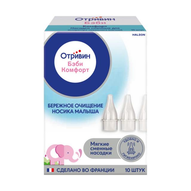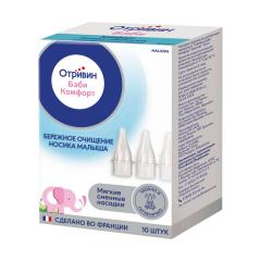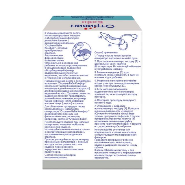 В упаковке содержится десять мягких одноразовых насадок с абсорбирующим фильтром для использования с аспиратором назальным Отривин Бэби комфорт, который приобретается отдельно. Анатомическая форма насадки позволяет легко установить в носовой ход ребенка, исключая травмирование. В каждой насадке содержится абсорбирующий фильтр, задерживающий слизистые выделения, что обеспечивает чистое и гигиеническое использование.
