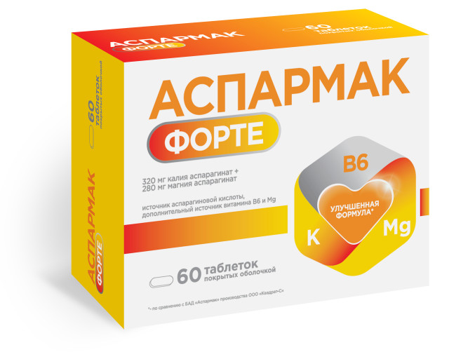 Биологически активная добавка к пище «Аспармак Форте» содержит более чем в полтора раза* увеличенное количество калия, магния, аспарагиновой кислоты, реализующих многонаправленное действие на организм – в частности, на сердечно-сосудистую и нервную системы.