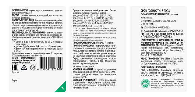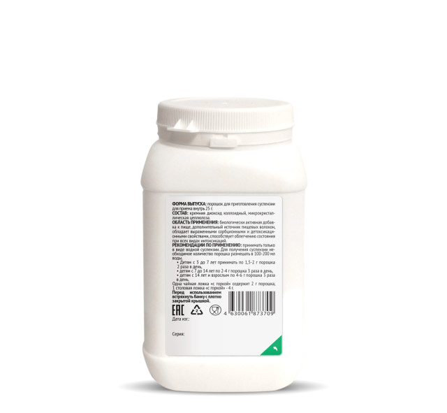 Область применения: биологически активная добавка к пище, дополнительный источник пищевых волокон, обладает выраженными сорбционными и детоксикационными свойствами, способствует облегчению состояния при всех видах интоксикаций.