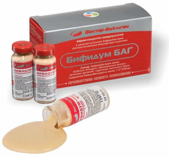 В состав препарата входит 5 штаммов бифидобактерий в концентрации до 1012 живых биологически активных клеток бифидобактерий в 1 мл на момент выпуска и не менее Ю10на конец срока годности.