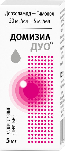 ДОМИЗИА ДУО® содержит два действующих компонента: дорзоламида гидрохлорид и тимолола малеат, каждый из которых уменьшает повышенное внутриглазное давление за счет снижения секреции внутриглазной жидкости, но посредством различных механизмов действия. Совместное действие этих веществ в составе комбинированного препарата ДОМИЗИА ДУО® приводит к более выраженному снижению внутриглазного давления.