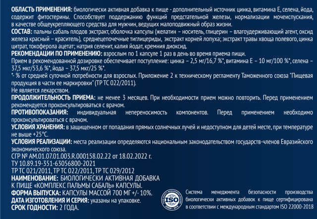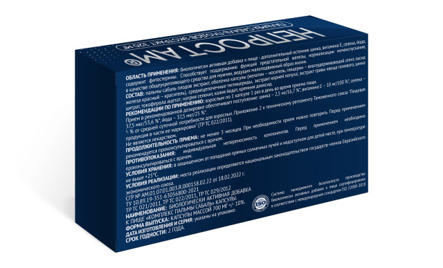 Состав: пальмы сабаль плодов экстракт, оболочка капсулы (желатин — носитель, глицерин — влагоудерживающий агент, оксид железа красный — краситель), среднецепочечные тиглицериды, экстракт корней лопуха; экстракт травы хвоща полевого, цинка цитрат, токоферола ацетат; натрия селенит, калия йодат, кремния диоксид.