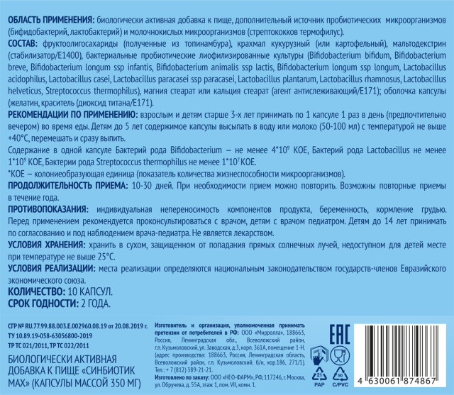 Область применения: биологически активная добавка к пище, дополнительный источник пробиотических микроорганизмов (бифидобактерий, лактобактерий) и молочнокислых микроорганизмов (стрептококков термофилус).