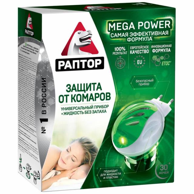 Прибор РАПТОР Пожаробезопасен. Быстро ликвидирует комаров, обеспечивает 100% защиту. В составе высокоэффективное японское действующее вещество etoc® (эток). Эффективная защита от комаров в помещении. Поворотная вилка позволяет использовать прибор с вертикальными и горизонтальными розетками. Эффективность подтверждена НИИД Роспотребнадзора РФ и тестами итальянских производителей. Просто и удобно в использовании. Без запаха.