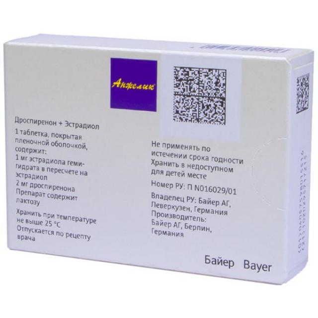 Препарат Анжелик® содержит 17-эстрадиол, химически и биологически идентичный эндогенному эстрадиолу человека, и синтетический прогестаген, дроспиренон. 17-эстрадиол обеспечивает замещение эстрогенов в женском организме во время и после наступления менопаузы. Добавление дроспиренона обеспечивает контроль над кровотечениями и предотвращает развитие обусловленной эстрогенами гиперплазии эндометрия.