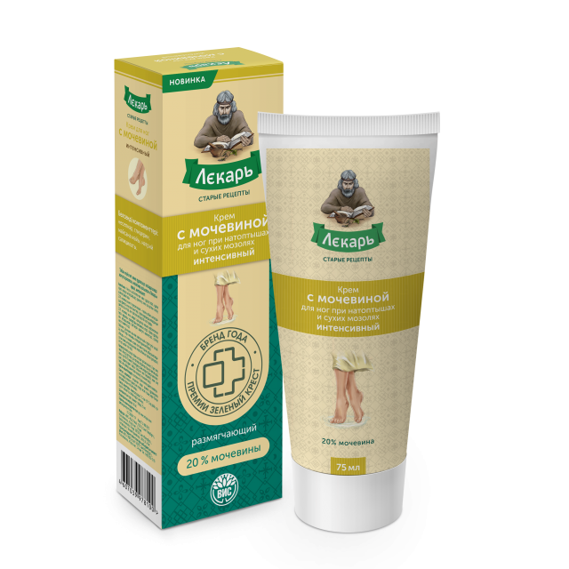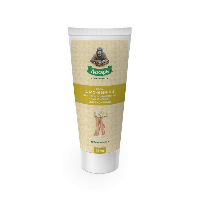 Лекарь Интенсивный – это крем с тщательно продуманной формулой для ухода за кожей ног при натоптышах и сухих мозолях на основе 20% мочевины. Действие активных компонентов направлено на интенсивное увлажнение, смягчение и поддержание здорового вида кожи стоп.