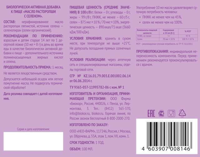 Компоненты пищевой ценностиСодержание в 10 мл (8 г)% РСП*ПНЖК, не менее5 г45%Селен70 мкг ± 10 %100 % ± 10 %