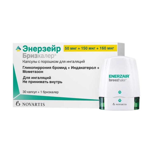 Препарат Энерзейр Бризхалер® является комбинацией индакатерола, длительно действующего бетаг-адреномиметика (ДДБА), гликопиррония, длительно действующего антихолинергического препарата (ДДАХ), и мометазона фуроата, ингаляционного синтетического глюкокортикостероида.