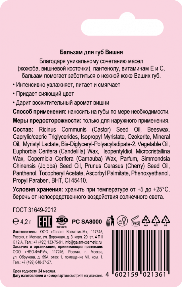 Состав: Ricinus Communis (Castor) Seed Oil, Beeswax, Caprylic/capric Triglycerides, Isopropyl Myristate, Ozokerite, Mineral Oil, Myristyl Lactate, Bis-Diglyceryl-Polyacyladipate-2, Vegetable Oil, Euphorbia Cerifera (Candelilla) Wax, Isopentyldiol, Microcristallina Wax, Copernicia Cerifera (Carnauba) Wax, Parfum, Simmondsia Chinensis (Jojoba) Seed Oil, Prunus Cerasus (Cherry) Seed Oil, Panthenol, Tocopheryl Acetate, Ascorbyl Palmitate, Phenoxyethanol, Propyl Paraben, BHТ, CI 45410.