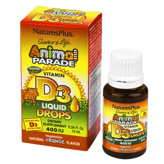 Animal Parade® D3 Vitamin Liquid Drops содержит 200 МЕ витамина Д3 в 1 капле и получен из лецитина подсолнечников. Имеет приятный апельсиновый вкус.