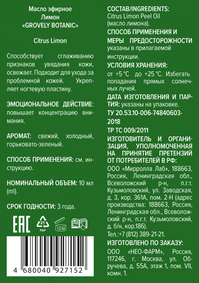 Состав/Ingredients: Citrus Limon Peel Oil (масло лимона).