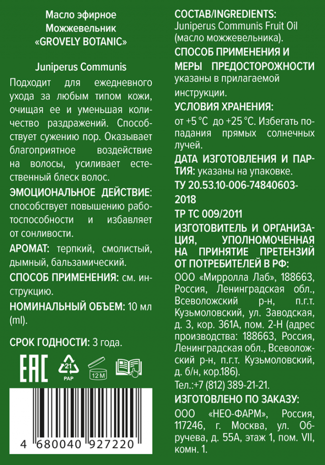 Масло эфирное Можжевельник 10мл Гровели Ботаник