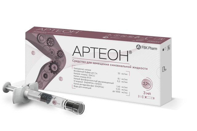 Вязкоэластичные свойства гиалуроновой кислоты, входящей в состав синовиальной жидкости, обеспечивают смазывание и амортизацию суставных поверхностей. Синовиальная жидкость в суставах при дегенеративных заболеваниях (остеоартроз) или травматических изменениях суставов имеет более низкую вязкость и эластичность, чем в здоровых суставах. Гиалуроновая кислота, входящая в состав Средства АРТЕОН® (ARTEON®), имеет молекулярную массу 2,2 млн дальтон, близкую к естественной гиалуроновой кислоте человека, и оказывает положительный эффект после введения при диагнозе «остеоартроз» («остеоартрит»).