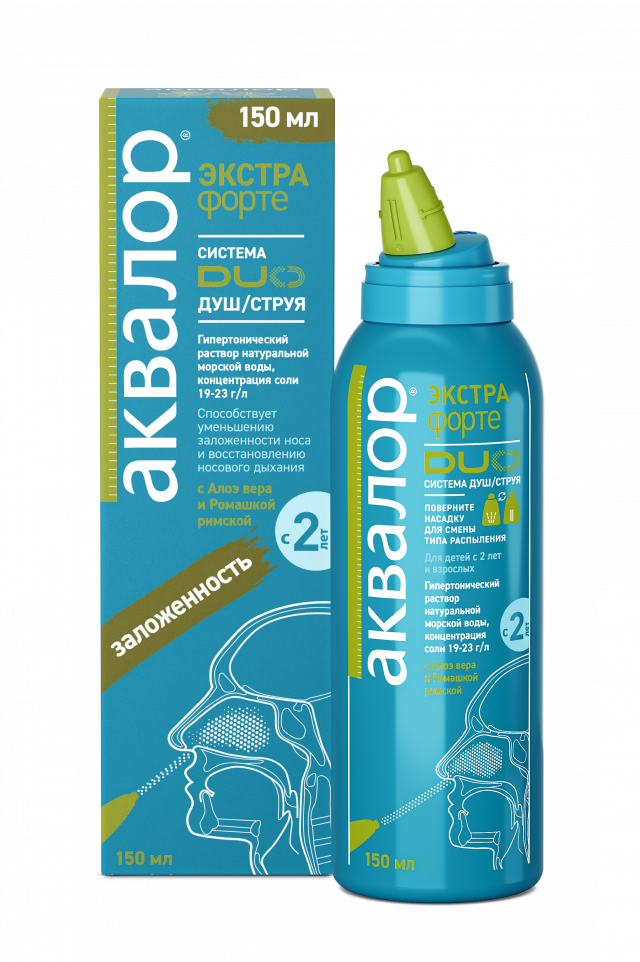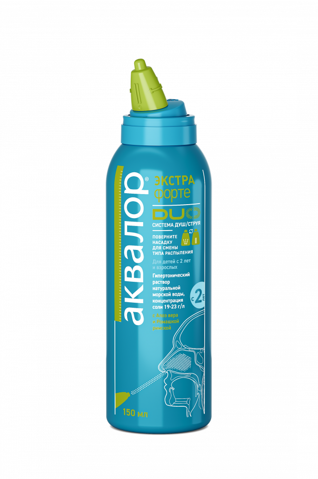 Аквалор Экстра Форте Дуо – гипертонический раствор морской воды, содержащий экстракты алоэ вера и ромашкой римской, предназначенный для промывания полости носа. Флакон объемом 150 мл снабжен инновационной поворотной насадкой с двойным типом распыления «душ/струя». Режим «душ» используется для снятия заложенности за счёт максимальной площади взаимодействия гипертонического раствора с отечной слизистой оболочкой, а режим «струя» — при сильном насморке для глубокого промывания полости носа и носоглотки за счет направленного действия.