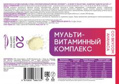 Состав: регулятор кислотности лимонная кислота, мальтодекстрин, регулятор кислотности натрия гидрокарбонат, L-аскорбиновая кислота, стабилизатор полиэтиленгликоль, ароматизатор «Ананас» (содержит декстрозу, мальтодекстрин, регулятор кислотности диацетат натрия, носитель триацетин, стабилизатор гуммиарабик), DL-альфа-токоферола ацетат, никотинамид, подсластитель сукралоза, кальция D-пантотенат, цианокобаламин, пиридоксина гидрохлорид, ретинола ацетат, холекальциферол, рибофлавин, тиамина гидрохлорид, краситель тартразин, фолиевая кислота, биотин.