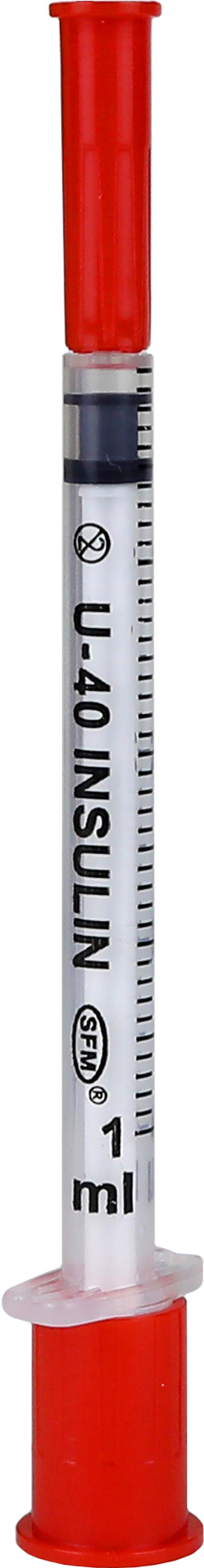Шприц инсулиновый U40 с интегрированной иглой состоит из трех компонентов: цилиндр, поршень и манжета. Имеет градуировку по шкале U-40, объем 0,5 мл, размер иглы 30 G. Безболезненность инъекции обуславливается легким скольжением поршня, без трения. Удерживающее кольцо на поршне предотвращает потерю медикамента. Градуировка на шприце выполнена в единицах инсулина и позволяет легко считывать показания.