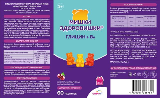 Здоровишки Глицин+В6 мармеладные пастилки жевательные №60 Гроувит
