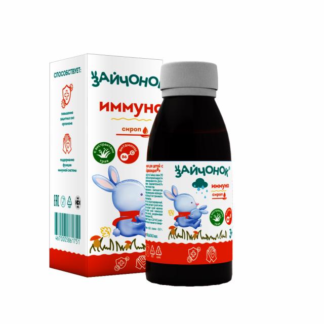 «Зайчонок® Иммуно» - вкусный, сироп с натуральными растительными экстрактами и витаминами для детей с 3-х лет. Компоненты, входящие в состав сиропа: витамины В6, С, а также экстракты липы, шиповника, малины, гибискуса и чабреца способствуют повышению защитных сил организма, поддержанию функции иммунной системы.