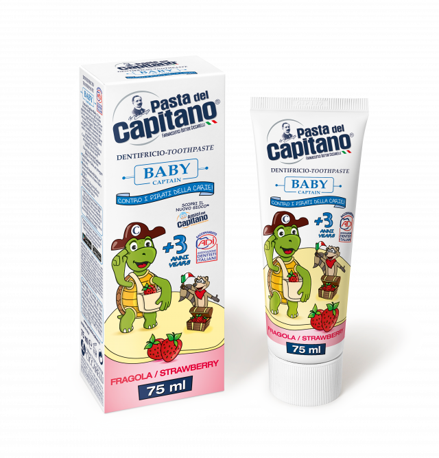 Pasta del Capitano Baby Strawberry Клубничная 3+ детская зубная гель-паста для малышей от 3-х лет с разноцветными микро-гранулами и ароматным вкусом клубники превратит ежедневную чистку зубов в интересное и увлекательное занятие.