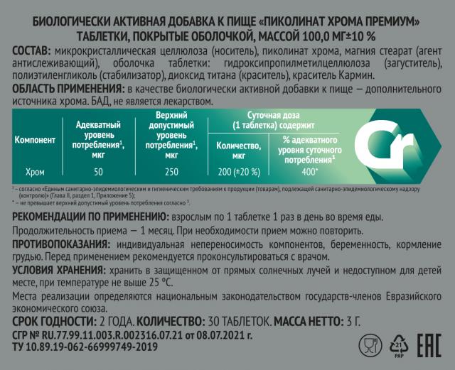 Область применения: в качестве биологически активной добавки к пище — дополнительного источника хрома. БАД, не является лекарством.
