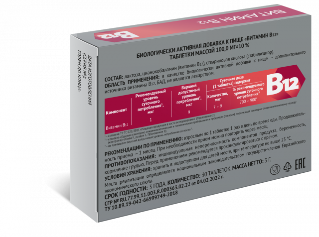 Область применения: в качестве биологически активной добавки к пище — дополнительного источника витамина В12. БАД, не является лекарством.
