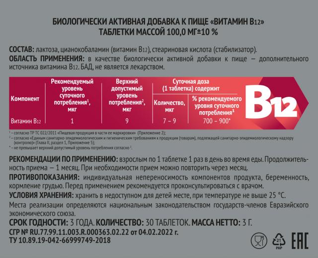 Состав: лактоза, цианокобаламин (витамин В12), стеариновая кислота (стабилизатор).