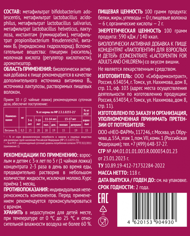 Изготовитель: ООО «Сибфармконтракт», Россия, 634034, г. Томск, ул. Нахимова, дом 8, стр. 11, оф. 103 (адрес места осуществления деятельности по изготовлению продукции: Россия, 634034, г. Томск, ул. Нахимова, дом 8, стр. 11).