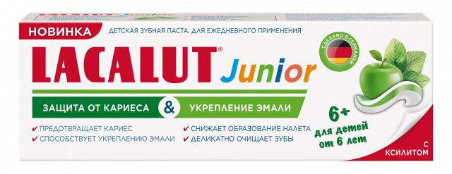 Детская зубная паста Lacalut Junior 6+ создана специально для ухода за зубами детей и подростков старше 6 лет. Свежий вкус яблока и мяты нравится детям. Фторид и ксилит реминерализуют эмаль и препятствуют образованию кариеса постоянных зубов, снижая образование бактериального налета. Кальций и гидроксиапатит укрепляют и полируют зубную эмаль. Мягкие абразивы бережно удаляют зубной налет.