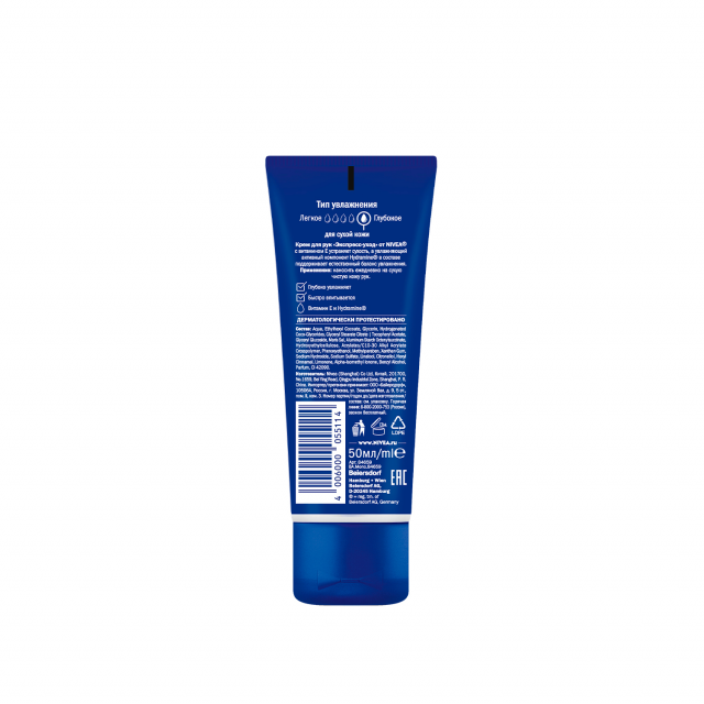 Нежная кожа рук регулярно подвергается воздействию негативных факторов, таких как частое применение антисептиков, холодный ветер, дождь, другие воздействия окружающей среды. Все это может привести к возникновению ощущения сухости, стянутости и дискомфорта. Попробуйте крем для рук «Экспресс-уход» от NIVEA с витамином Е и Hydramine®. Крем устраняет сухость, а увлажняющий активный компонент Hydramine® в составе поддерживает естественный баланс увлажнения.