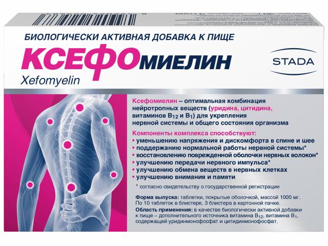 Биологически активная добавка к пище «Ксефомиелин» содержит важные компоненты (нуклеотиды и витамины), необходимые для восстановления нервных волокон и укрепления нервной системы. Благодаря оптимальному составу компоненты Ксефомиелина способствуют нормализации работы нервных волокон, уменьшению неприятных ощущений, напряжения и дискомфорта в мышцах спины, шеи, конечностей. Все это способствует повышению активности, подвижности и сохранению хорошего самочувствия.