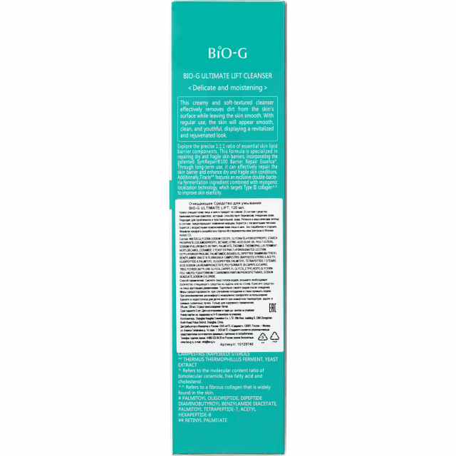 Мягкая очищающая формула средства для умывания Bio-G (Био-Джи) Ultimate Lift Cleanser максимально бережно удаляет загрязнения с кожи лица и шеи, не травмируя её и не вызывая шелушений. Гиалуроновая кислота напитывает кожу влагой, притягивая молекулы воды, создаёт внутренний объём тканей и поддерживает гидробаланс. Церамиды и гидрогенизированный лецитин помогают удерживать влагу, укрепляя кожный барьер и восстанавливая его целостность. Запатентованный комплекс бибактериальной ферментации стимулирует рост новых клеток кожи и способствует повышению защитных функций кожного барьера от окисления мембранных липидов, инфракрасного и UV-излучений. Современные пептиды, доказавшие свою высокую эффективность в борьбе с признаками старения, успешно решают широкий спектр уходовых задач: повышают упругость и эластичность кожи, стимулируя выработку собственных коллагена и гиалуроновой кислоты в клетках кожи; снижают воспаление и тормозят разрушение коллагена; расслабляют мышечные ткани и зажимы, приводящие к образованию и углублению мимических морщин и заломов (безопасная альтернатива ботокса). Их комплексное действие позволяет улучшить структуру кожи, сократить глубину морщин и предотвратить появление новых признаков возрастных изменений кожи. Ретинил пальмитат (производная витамина А) является мощным антиоксидантом, стимулирует обновление клеток эпидермиса и замедляет старение кожи. Фитостеролы рапсового масла и бисаболол успокаивают кожу, снимают раздражение, сухость и воспаления, а бисаболол также обладает мягким отбеливающим эффектом, уменьшая выраженность пигментных пятен и следов от акне.