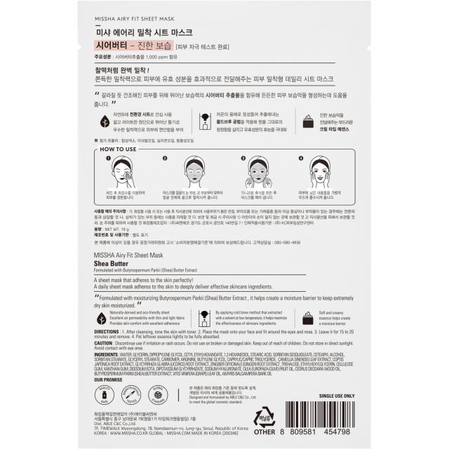 Одноразовая тканевая маска MISSHA Airy Fit Sheet Mask Shea Butter с масло ши эффективно увлажняет, напитывает и успокаивает сухую и обезвоженную кожу.
