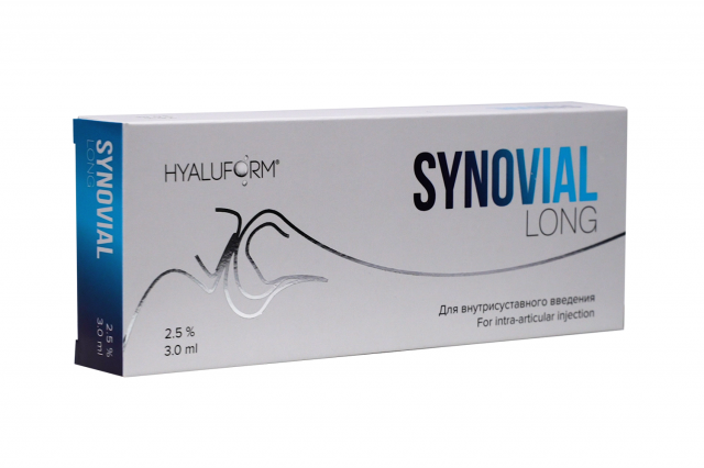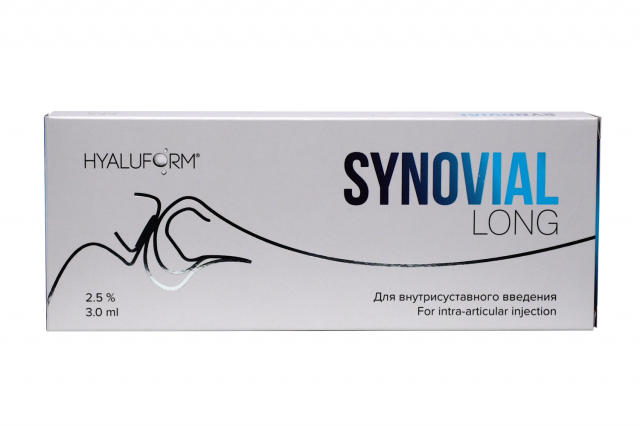 Гиалуформ® 2,5 % Синовиаль поставляется по 3,0 мл в стеклянном шприце с Luer-Loсk наконечником. Содержимое стерилизовано паром (влажным теплом). Шприц с материалом и 2 этикетки для врача, прикрепленные к шприцу, вложены в запечатанный блистер. По одному блистеру вместе с инструкцией по применению вложено в картонную коробку. Этикетку для врача следует прикрепить к медицинской карточке пациента для обеспечения возможности идентификации медицинского изделия.