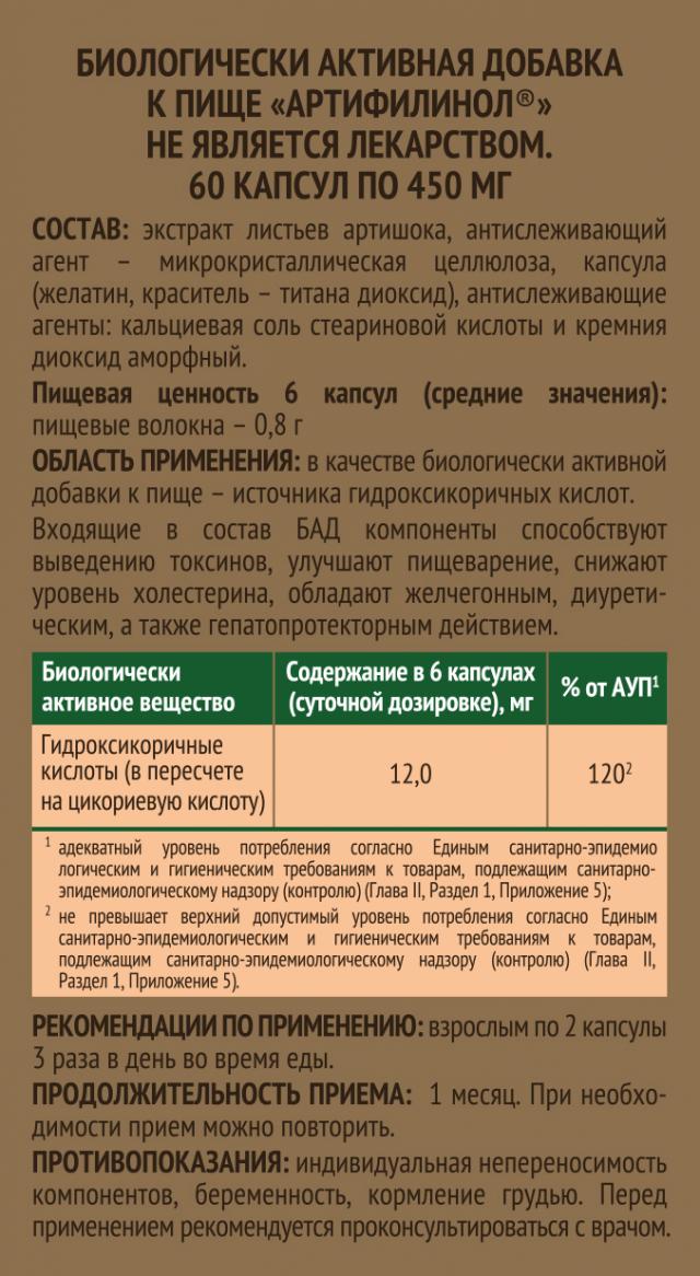 Биологически активная добавка к пище «Артифилинол®»источник гидроксикоричных кислот