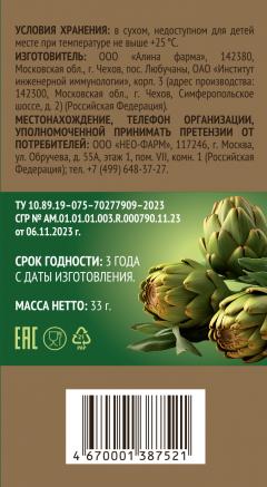 Состав: экстракт листьев артишока, антислеживающий агент – микрокристаллическая целлюлоза, капсула (желатин, краситель – титана диоксид), антислеживающие агенты: кальциевая соль стеариновой кислоты и кремния диоксид аморфный.
