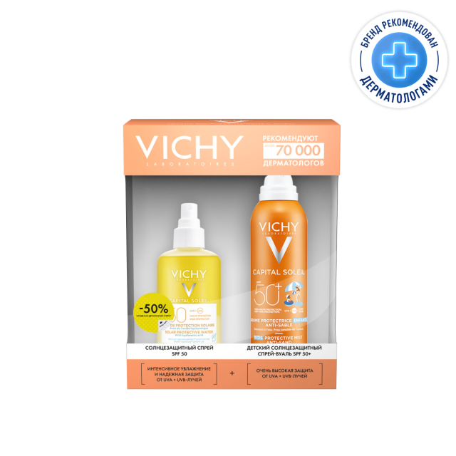 Виши Капитал Солей набор спрей солнцезащитный двухфазный увлажняющий SPF50 200мл+спрей детский Анти-Песок SPF50 200мл