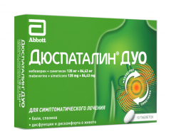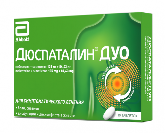Препарат Дюспаталин® Дуо представляет собой комбинированный препарат, в состав которого входят следующие действующие вещества – мебеверин и симетикон.