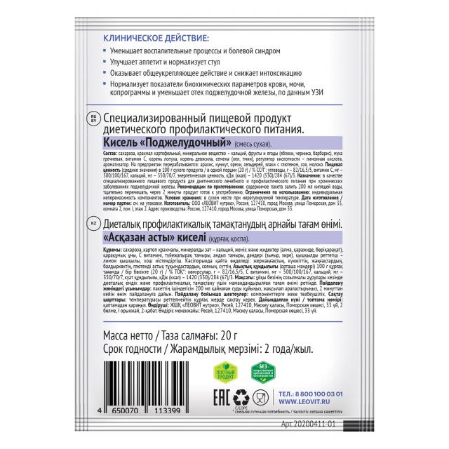 Кисель Поджелудочный это специализированный пищевой продукт диетического профилактического питания. Кисель ЛЕОВИТ применяется в качестве диетотерапии в комплексной терапии при хронических заболеваниях поджелудочной железы в стадии обострения. Напиток оказывает благоприятное воздействие на функцию поджелудочной железы, способствуют уменьшению воспалительных процессов поджелудочной железы, снижает риск обострения хронического панкреатита и эффективен для коррекции питания при хроническом панкреатите.