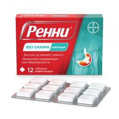 Антацидный препарат местного действия. Таблетка Ренни содержит антацидные вещества – кальция карбонат и магния карбонат, которые обеспечивают быструю и продолжительную нейтрализацию избыточной соляной кислоты желудочного сока, тем самым оказывая защитное действие на слизистую оболочку желудка. Достижение положительного эффекта в течение 3–5 минут обусловлено хорошей растворимостью таблеток и высоким содержанием кальция.
