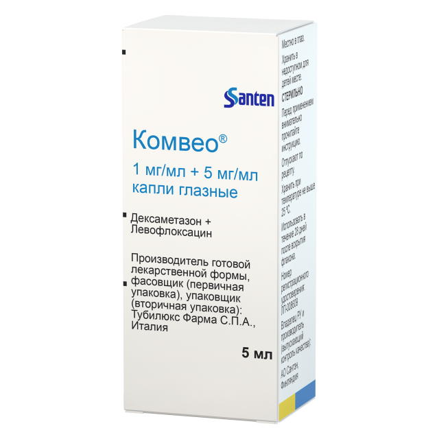 Сто двадцать пять пациентов, перенесших хирургическую операцию по удалению катаракты, были рандомизированы на 3 группы: левофлоксацин, дексаметазон и препарат Комвео®. Одна капля каждого препарата вводилась за 60 и 90 минут до лимбального парацентеза роговицы. Среднее значение полученных концентраций левофлоксацина составило 711,899 нг/мл (95 % ДИ: 595,538; 828,260) в группе препарата Комвео® по сравнению с 777,307 нг/мл (95 % ДИ: 617,220; 937,394) при введении левофлоксацина отдельно. Концентрации левофлоксацина в водянистой влаге глаза значительно превышают минимальные подавляющие концентрации для патогенных микроорганизмов, входящих в спектр действия левофлоксацина.